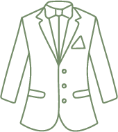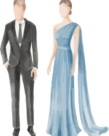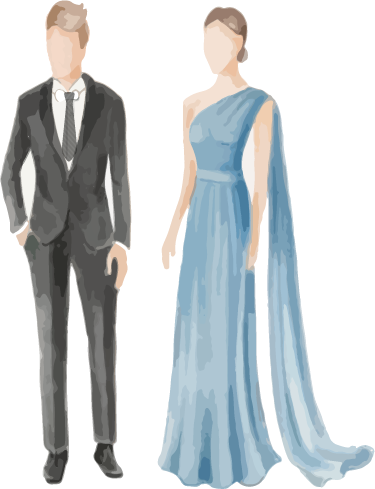 Damas: Vestido Largo unicolor, Se reserva el blanco y el verde. Caballeros: Saco y Corbata